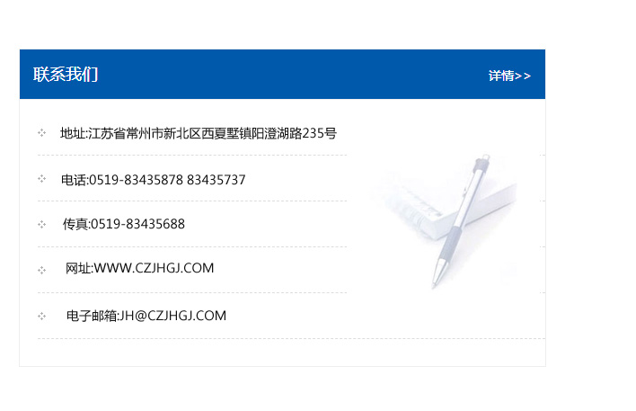 地址:常州市新北區友邦商務大廈1幢16、17層  電話:0519-85101652  傳真:0519-85112595  郵編:213022  網址:www_cz-jiayue_cn.jiandejituan.com  郵箱:xiajifengaa@163.com